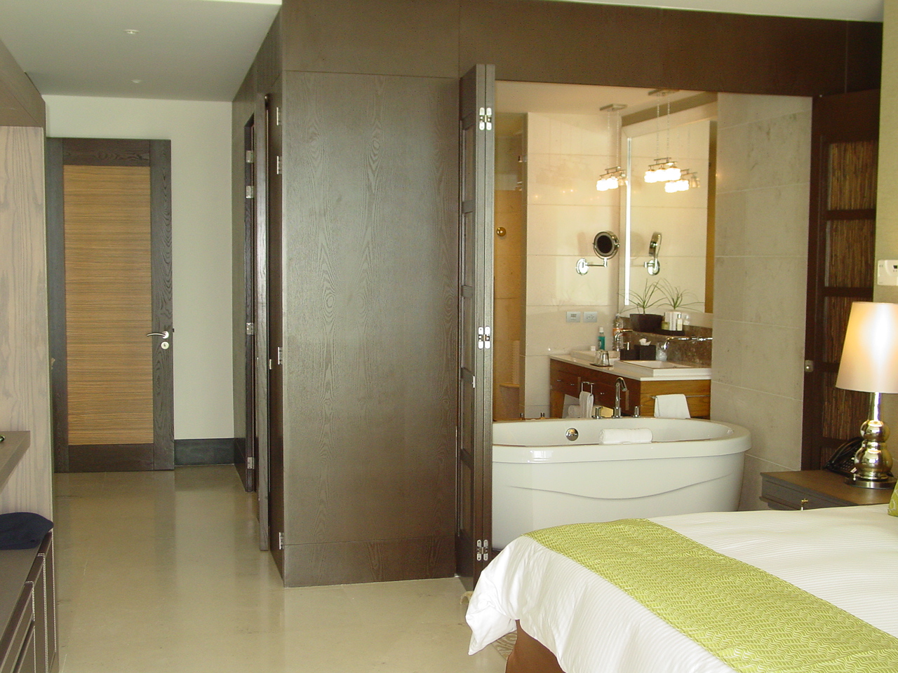 The bedrooms are about the same sizes as the bedrooms in the Grand Luxxe Villa. There is a hall way that connects the master bedroom to the living area, which provides extra privacy and is a very nice feature. The bath areas are about the same size and configurations as the Grand Luxxe Villa. There is a half bath in the Exclusive Master Villa (2 Bedroom side) and not in the Exclusive Villa.
