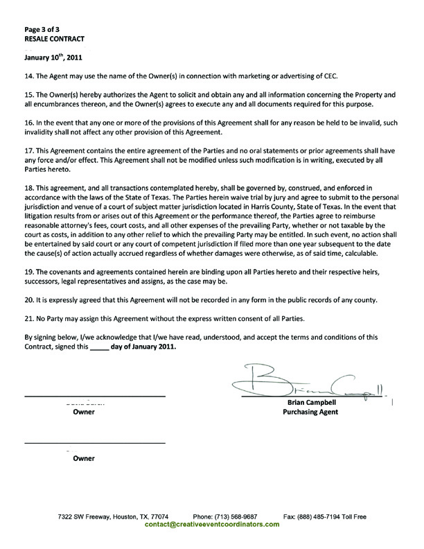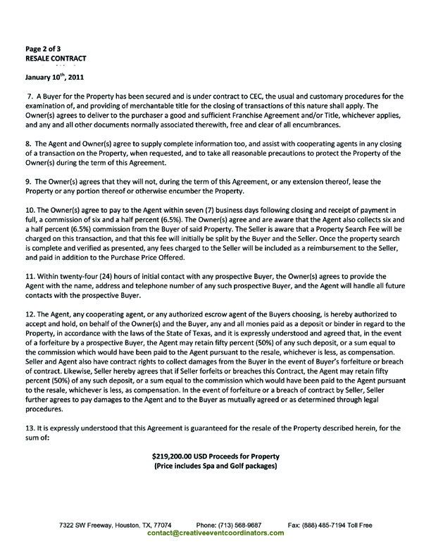 Creative Event Coordinators (CEC) in Houston Texas contacted us in November 2010 asking to rent six weeks of our timeshare in Mexico to a corporate client. They also said they could sell our timeshare, which we opted for. They said a 6.5% commission would be due only after we received proceeds from the sale. We had a lawyer review the contract and CEC agreed to make several changes based on our attorney's recommendation.