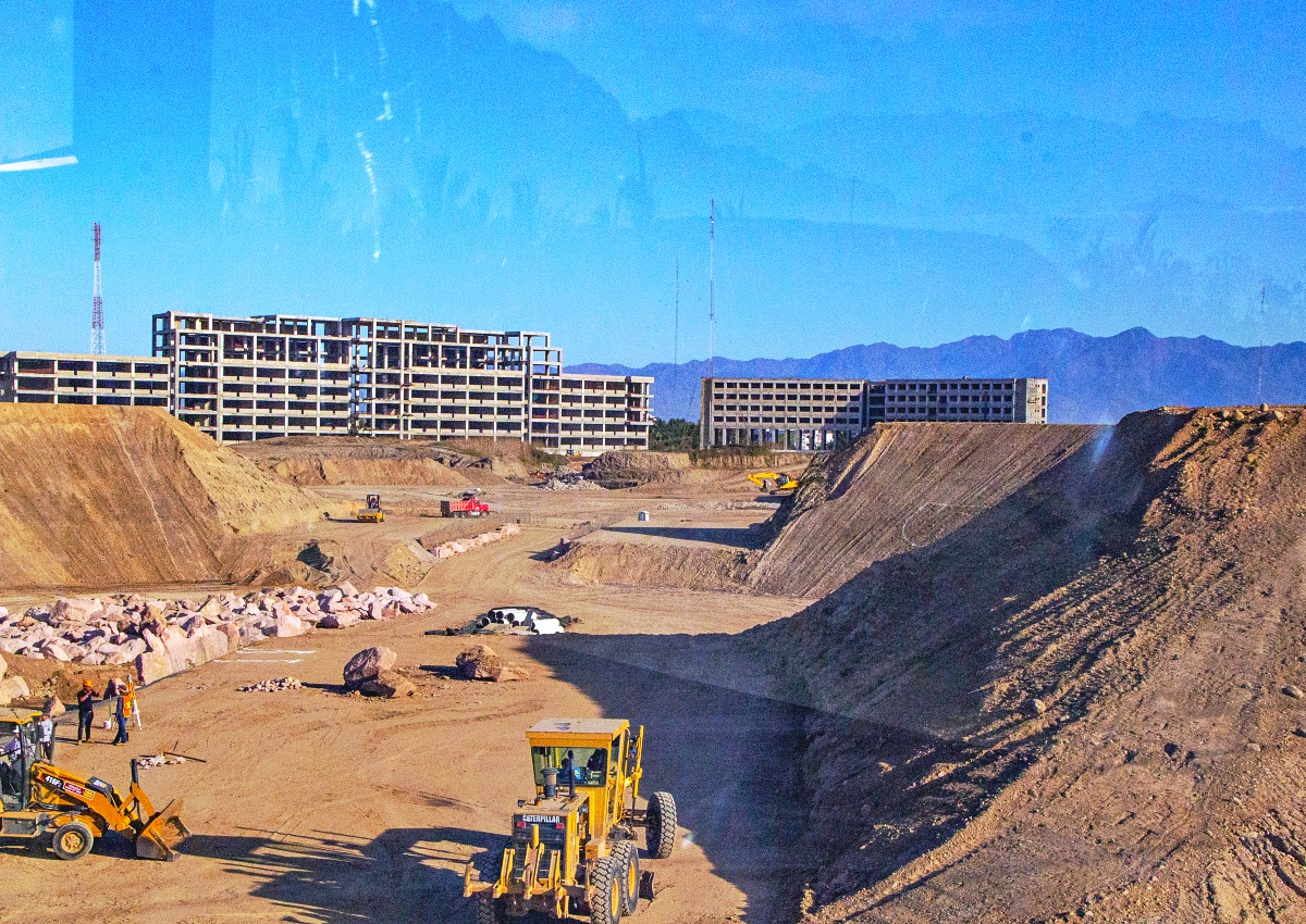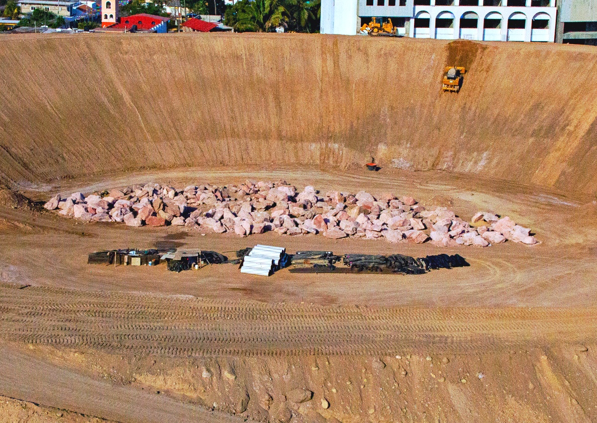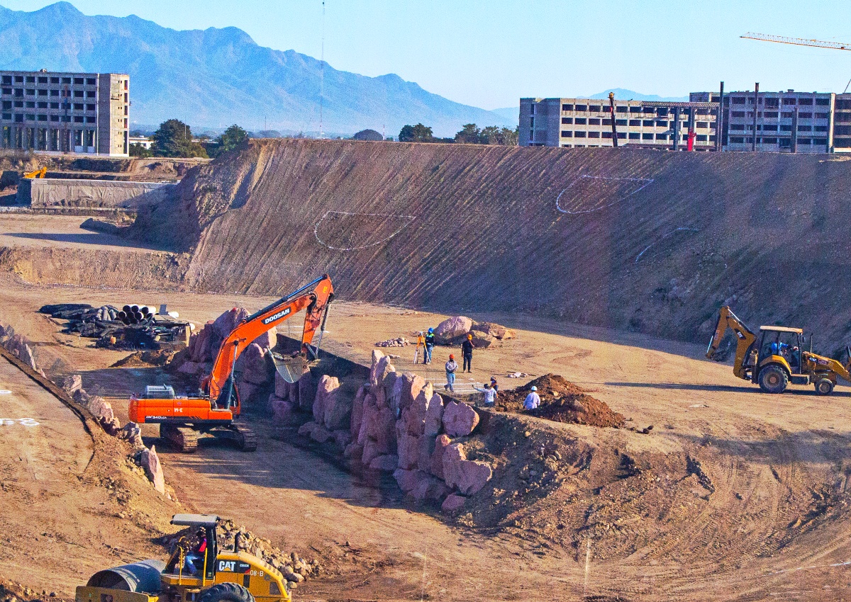 An opening between two massive walls of dirt appears, and workers and equipment are at the bottom of the valley. They are installing large rocks and boulders similar to the ones installed at the Grand Bliss Lagoon, which we called Red Rock Point.