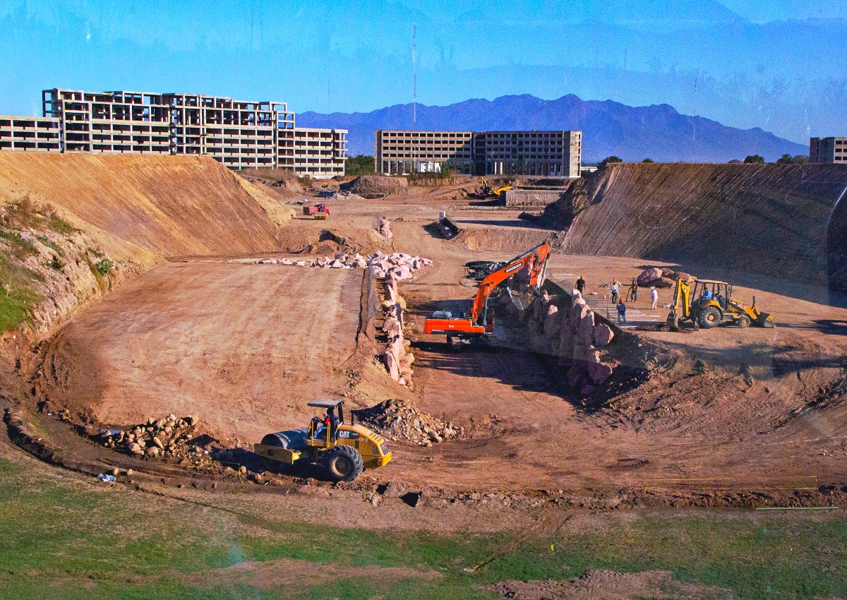 The Parks I is comprised of the area west of Highway 200 to an area near Station 4. You can see in the signage a circular lagoon. This may be the circular bowl that is under construction in the following photos. It appears to be a feature that may have water spouts and a walkway around the rim. Speculation only. What do you think it will become?