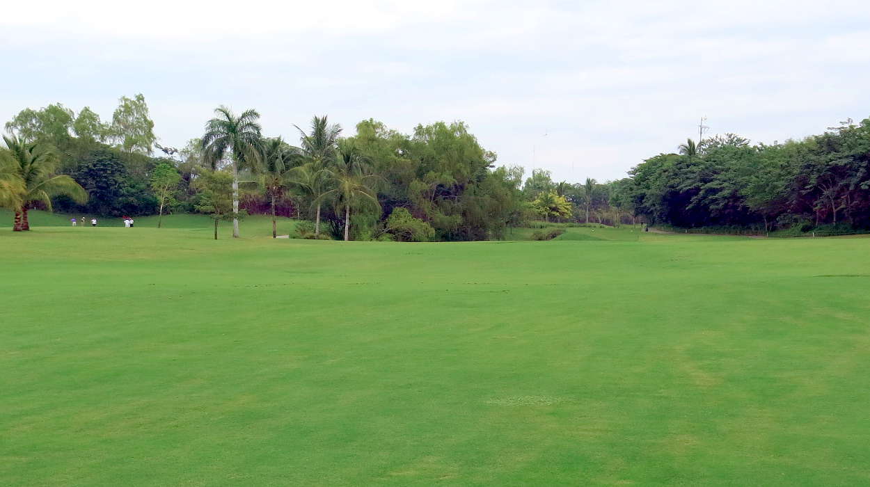 The Jack Nicklaus course first hole is near the driving range and golf academy - a long way away from Tower Five. The course proceeds along a route that parallels the river road to an area in front of Tower Five. It then moves to the area north of the taxi and valet parking area. The road at this point was used by taxis and shuttles that took guests to the outer gate to walk the Marina area. Now, foot traffic is discouraged by hotel management.