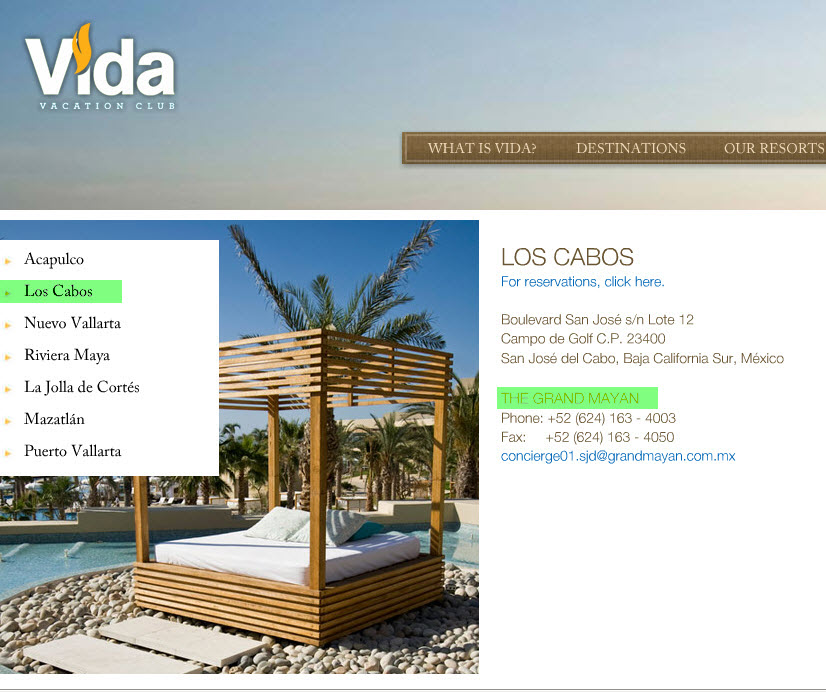 We have received calls asking how to contact the various resorts and corporate offices and thought it would be helpful if we could post the information in our newly formatted Contacts Page. The table below shows the current information for each operating resort in the Vida Vacation Club network as of February 9, 2011. We will post changes as we receive them.To use this table, simply click the word "Select". An image will download, which will contain the contact information for the resort as well as the email address for the resort's concierge. When done, close the application that displays the image. You can also save the image for future reference.