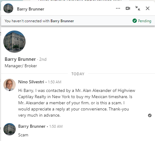 This is the one I told you about in a previous email that was going to send me a rental agreement on Vidanta letterhead. I didn’t receive it. He probably knew that I was on to him.