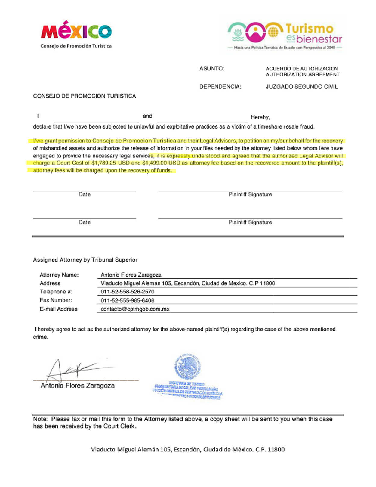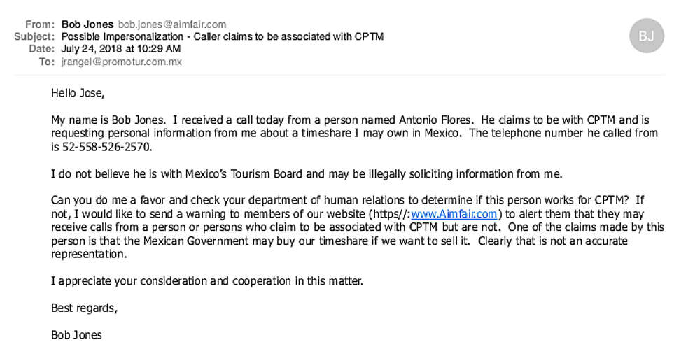 We received a call from Sr. Antonio Flores yesterday morning. Nice guy. Had our cell phone number, home phone and email address. Knew that we owned a timeshare in Mexico and wanted us to paricipate with the Mexico Tourism Board (CPTM) in its efforts to identify and prosecute scams coming from Mexico. Names he claimed to have investigated and stopped include Lone Star Vacations and others. Very convincing and engaging person. He was calling from 52-558-526-2570 (BTW - this number shows as a US number.).The caller asked a number of questions, indicating he did not have much information about our timeshare ownership. I asked if he had a form that I could review, and he said he would send it out for me to complete. Following is what he sent: