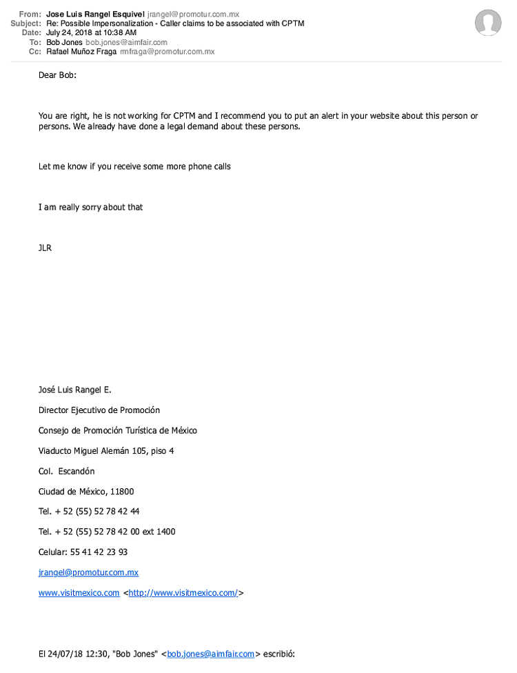 Note the domain in the email address. In February, 2018, an Aimfair member asked if a similar CPTM inquiry was legit. No, it was not. The sending domain is cptmgob.com.mx, which is not a domain owned by the Mexican government.
