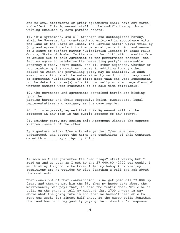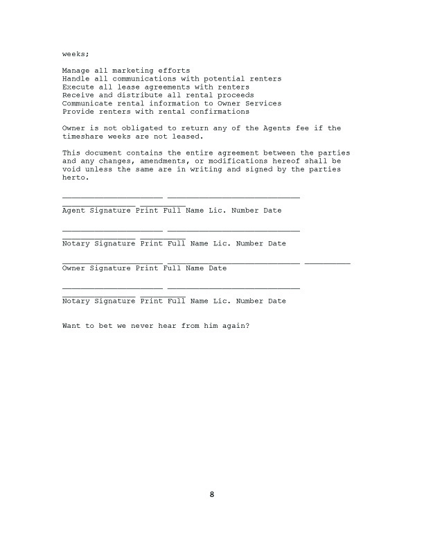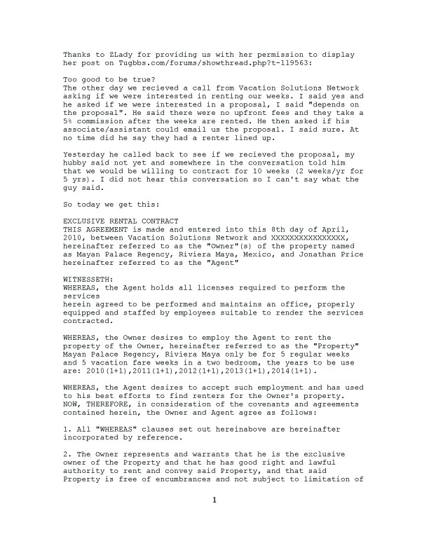 We decided to make a few inquiries ourselves and found on TUG (Timeshare Users Group) a post by ZLady. After reading her post, we asked for and received her permission to post her experience with and contract from Vacation Solutions Network.