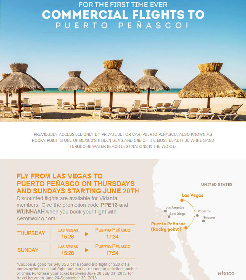Grupo Vidanta sent us all an announcement that Aeromexico will start regularly scheduled service from Las Vegas to Puerto Penasco on June 20, 2013. This is certainly great news for Grupo Vidanta because it opens the door a little wider for increased visits to its beautiful Mayan Palace property at La Jolla de Cortes.In case you have not seen the announcement, a copy appears below: