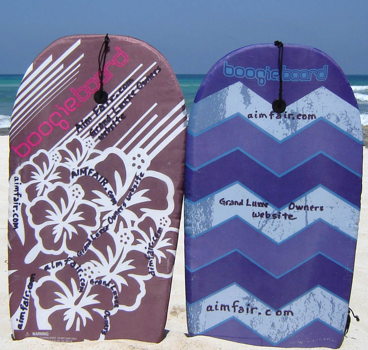 We just returned from 2 weeks at the GL RM. Here is a photo of the two belly boards that we leave with the Concierge at the GL Pool in Riviera Maya nightly and when we depart the resort at the end of our stay. While there, we keep the boards on the beach at our Palapa Number 5, right in front of the main entrance to the beach from the GL pool. They can be seen by nearly everyone who walks down to the beach. This should increase the number of GL people that know about Aimfair. I told her that she can let other people use the belly boards until we return in October. That will let a lot of people see the Aimfair.com that I wrote on them with a felt pencil. When they are not being used, they are leaning against the back of the Concierge office by the main Grand Luxxe pool and the Burger Custom Made, advertising Aimfair to people who visit the Concierge desk. When GL Management sees the Aimfair on the boards, they may turn them around so the plain black bottom shows. It will be fun to see what happens for the next 3 months with this cheap advertising. Watch for an increase in hits from people looking at the RM location. The boards only cost us $6 each at a local dollar store, so it is a really inexpensive way to get Aimfair on the beach.