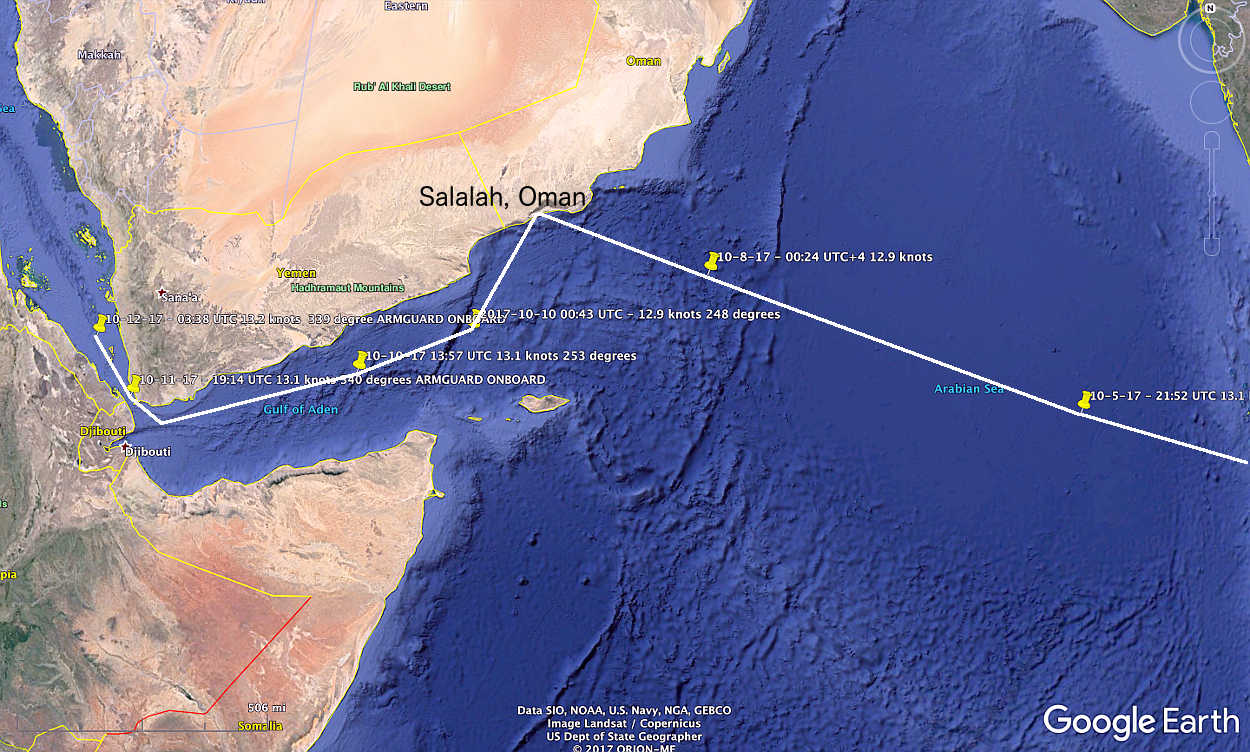 Vidanta Alegria's first port after leaving Singapore was Shalalah, Oman. It arrived on October 8 and left the next morning. There was no destination given other than the Red Sea area and Armguards Oboard.
